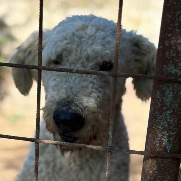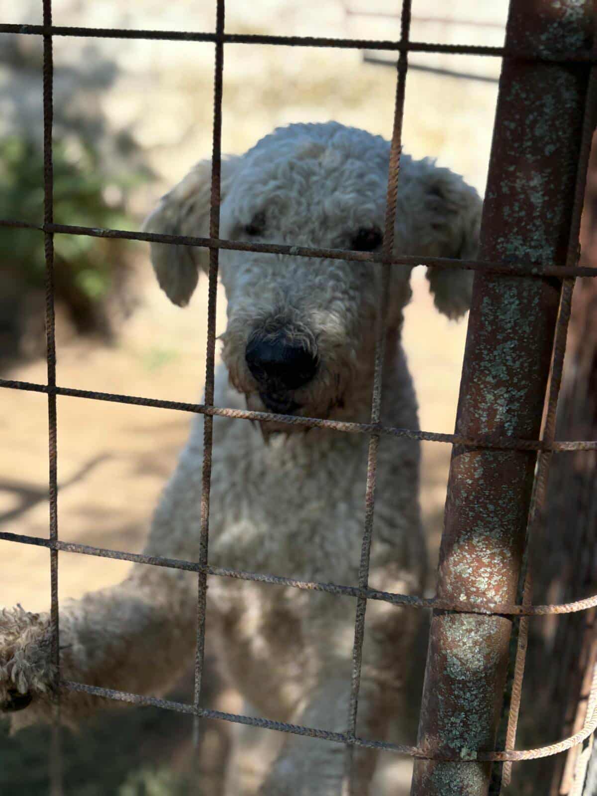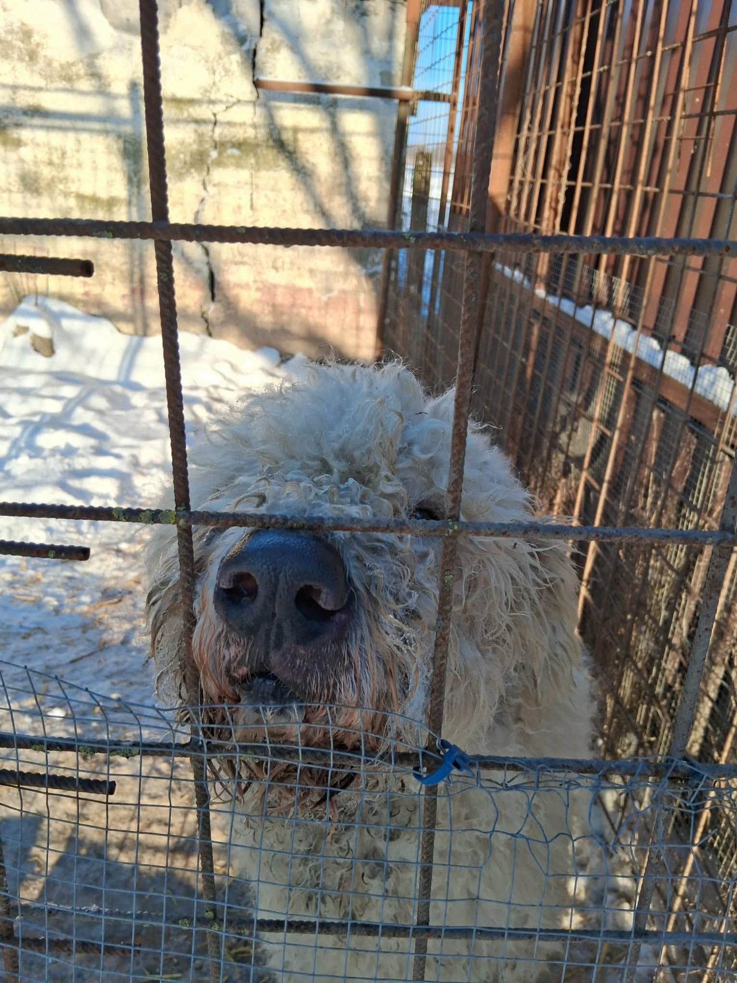 Brumi wurde aufgrund schlechter Haltung enteignet. Er hat von Welpe an an der Kette gelebt, ohne einen Unterschlupf, der ihn vor Wind und Wetter hätte schützen können. Das lockige Fell der Komondore, das richtig lang wird, soll diese Aufgabe eigentlich übernehmen. Aber wenn es nicht gepflegt wird, wird es im Laufe der Zeit zu einem verfilzten und vor Dreck starrenden Panzer, der den Hund in seiner Bewegungsfreiheit einschränkt. Und so kam Brumi völlig verwahrlost ins Tierheim.